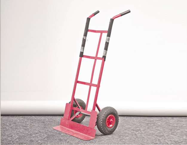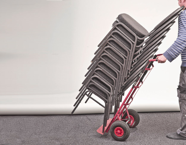 Praktischer Stuhltransportwagen mit breiten Luftreifen (Sackkarre) erleichtert das verfahren, verteilen von bis zu 14 gestapelten Bankettstühlen auf nahezu jedem Untergrund.